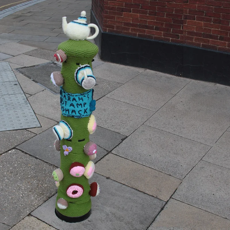 In het Verenigd Koninkrijk is “yarn bombing” van brievenbussen uitgegroeid tot een herkenbaar en geliefd straatbeeld. Vooral de iconische rode brievenbussen krijgen regelmatig een gehaakte of gebreide “muts”, vaak afgestemd op een thema zoals Kerstmis, Pasen, herdenkingen of lokale evenementen. Deze zogeheten “postbox toppers” zijn meestal losse objecten die boven op de brievenbus worden geplaatst, zodat ze de functie niet hinderen. Ze worden vaak gemaakt door lokale haak- en breigroepen en soms ingezet om aandacht te vragen voor goede doelen of om geld in te zamelen. De traditie laat mooi zien hoe yarn bombing kan uitgroeien tot een vriendelijke, gemeenschapsgerichte vorm van straatkunst.