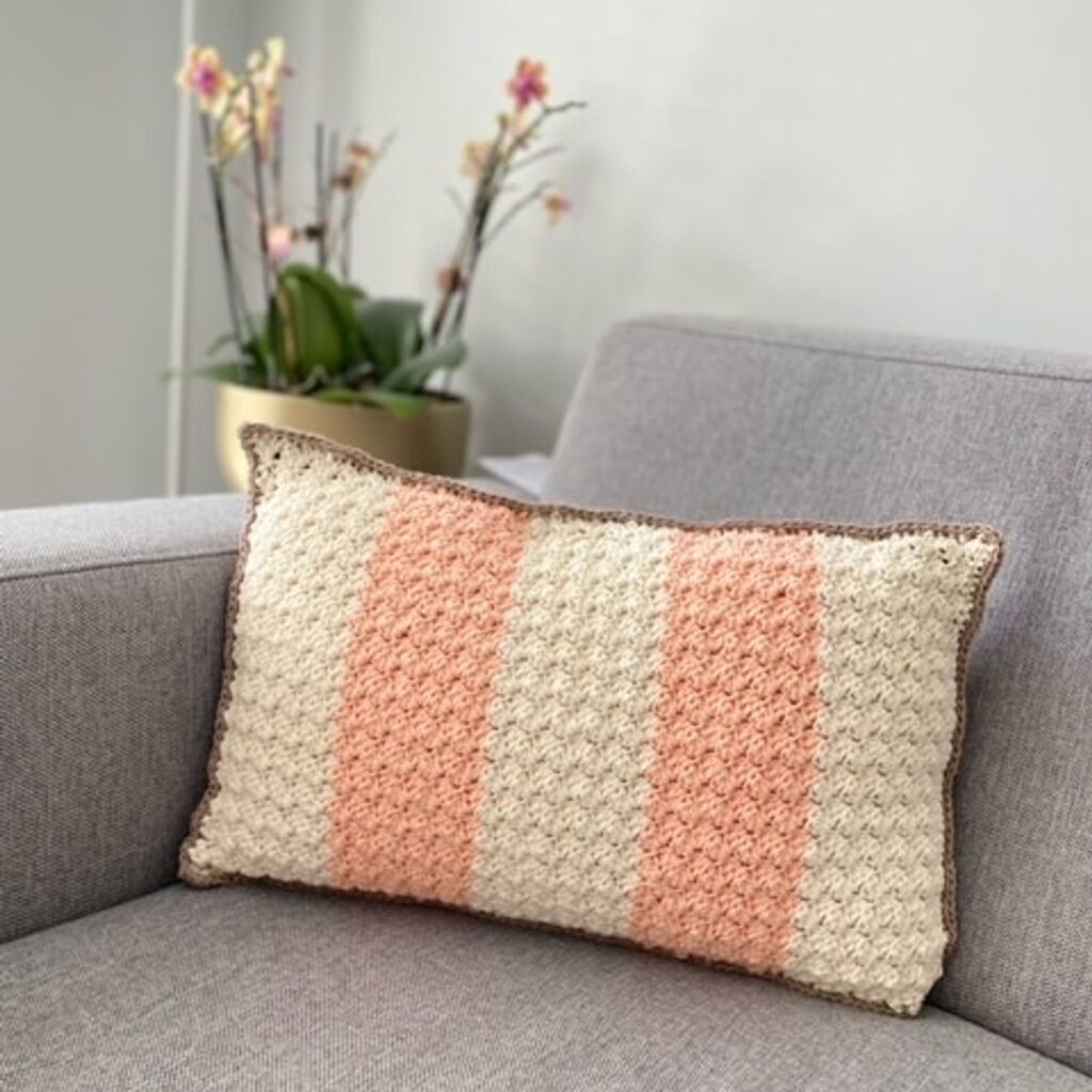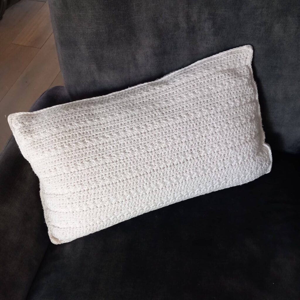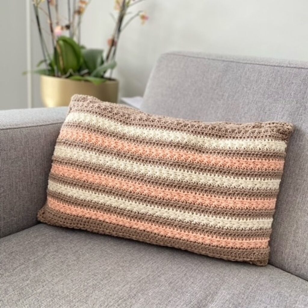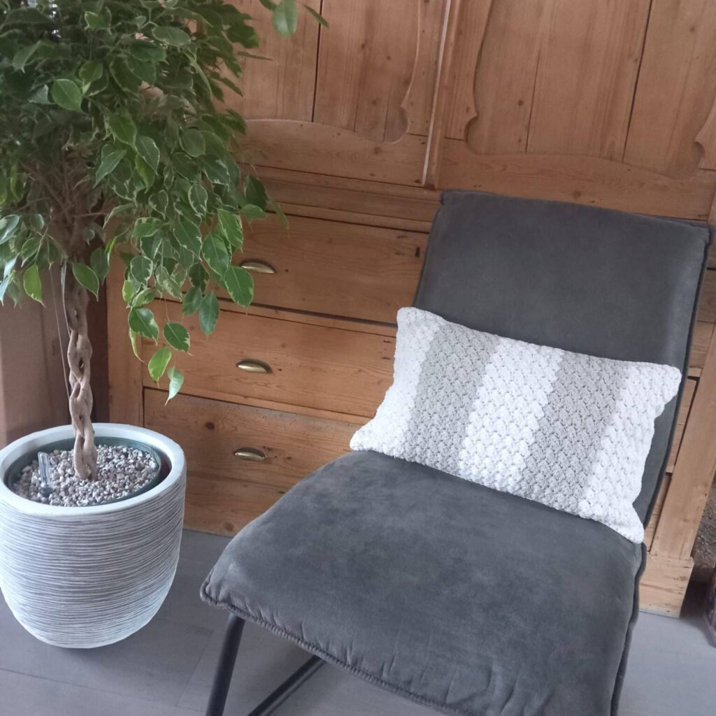 Zon, zomer, vakantie, vrolijke kleuren… een gezellig kussen voor de zomer, dat was de inspiratie voor dit vrolijke brede strepenkussen. Het kussen is gehaakt met Lammy Eco Cotton.