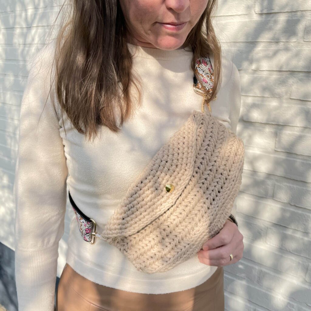 Geïnspireerd door de crossbody bags die momenteel echt een trend zijn, kwam dit tasje uit Teuni’s haaknaald tevoorschijn. Voor het voorpand koos zij voor de mooie visgraatsteek. De schouderbanden kun je in veel winkels of online kopen in welke kleur of design je maar wilt. Doordat de band verstelbaar is kun je het tasje kort én lang dragen. Ook is de band eenvoudig te verwisselen. Dus als je een neutraal garen kiest voor het tasje kun je met de band lekker variëren in stijl en kleur. We zijn nu al benieuwd naar jouw versie!