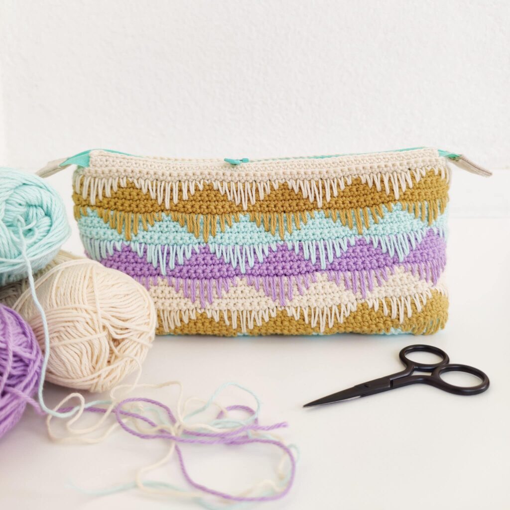 De piekvasten worden in een golvend patroon gehaakt, daardoor ontstaat er een verrassend patroon. Speel met kleuren en haak jouw eigen unieke etui!